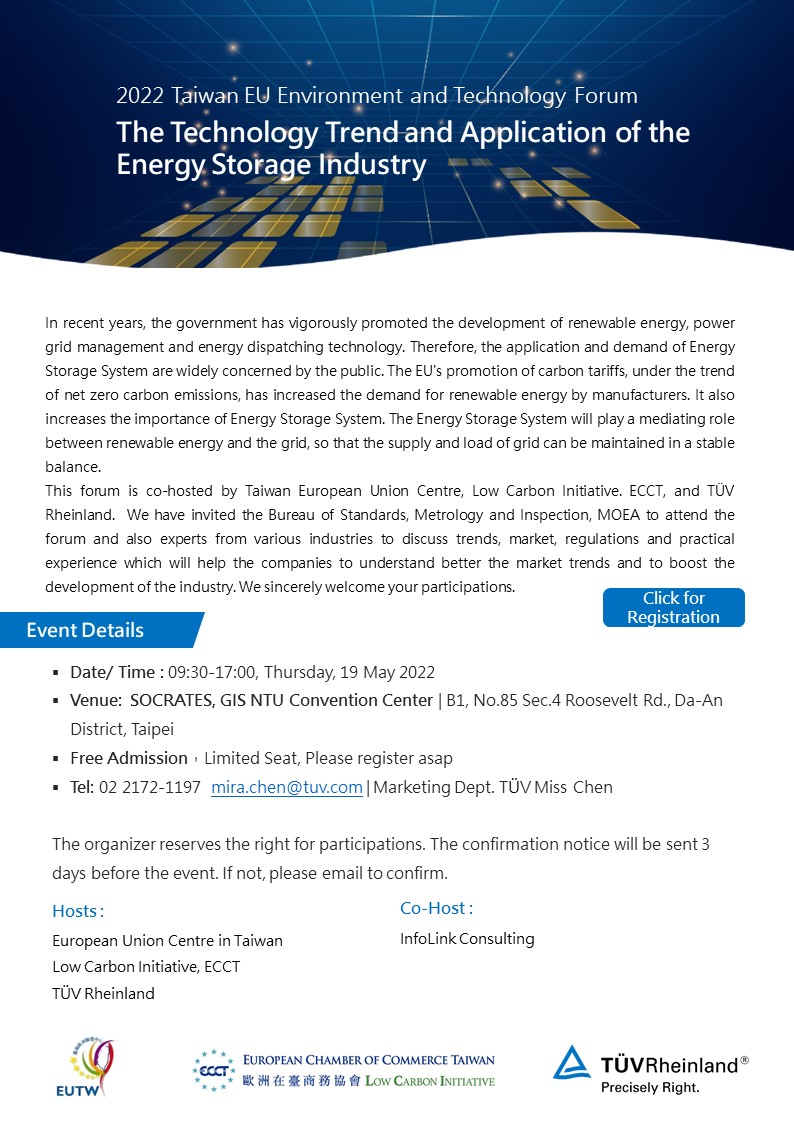 This forum is co-hosted by European Union Centre in Taiwan, Low Carbon Initiative. ECCT, and TÜV Rheinland. We have invited the Bureau of Standards, Metrology and Inspection, MOEA to attend the forum and also experts from various industries to discuss trends, market, regulations and practical experience which will help the companies to understand the market trends better and to boost the development of the industry. We sincerely welcome your participations.