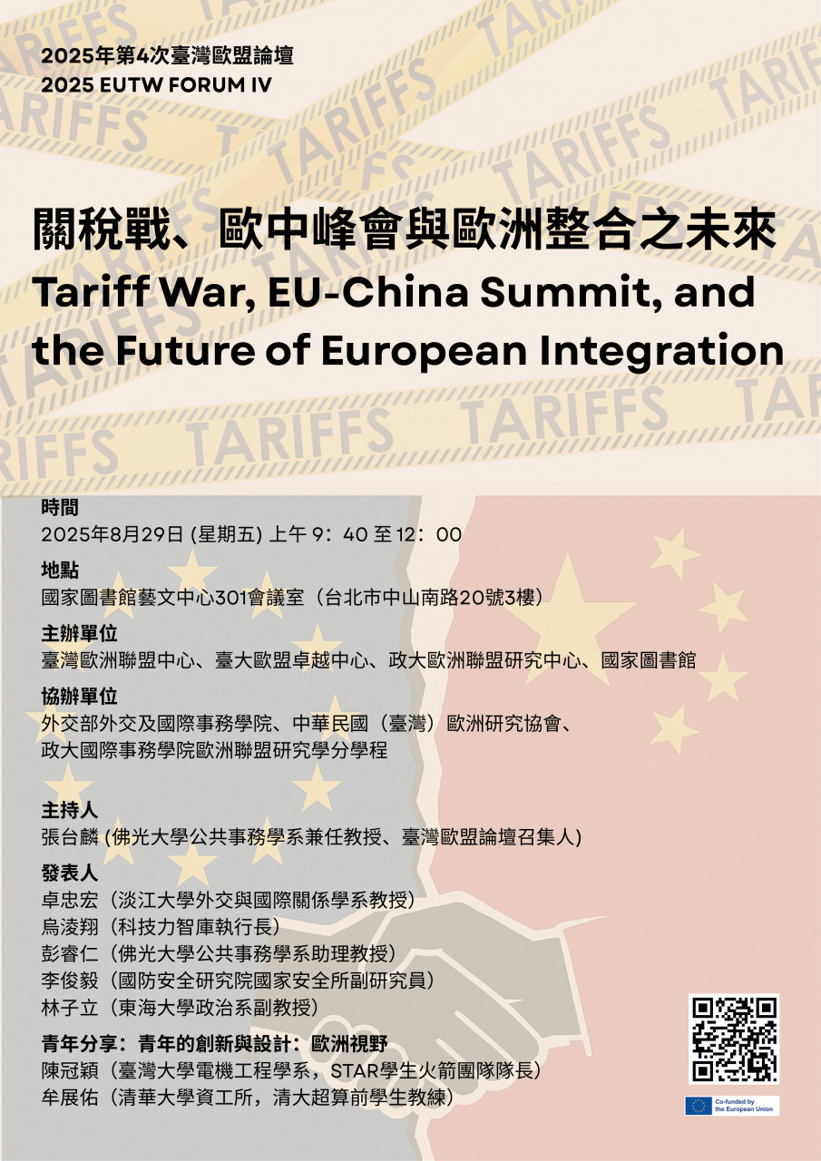 10:00-12:00 (120分鐘) 2025年第4次臺灣歐盟論壇:關稅戰、歐中峰會與歐洲整合之未來