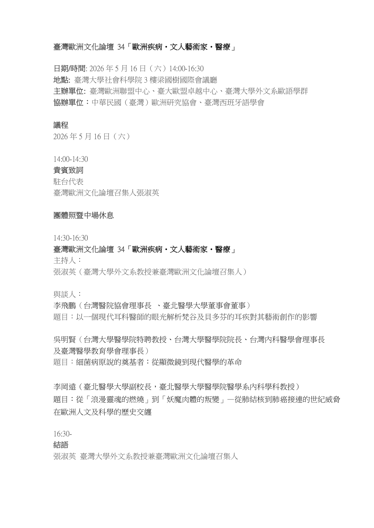 臺灣歐洲文化論壇 34「歐洲疾病・文人藝術家・醫療」