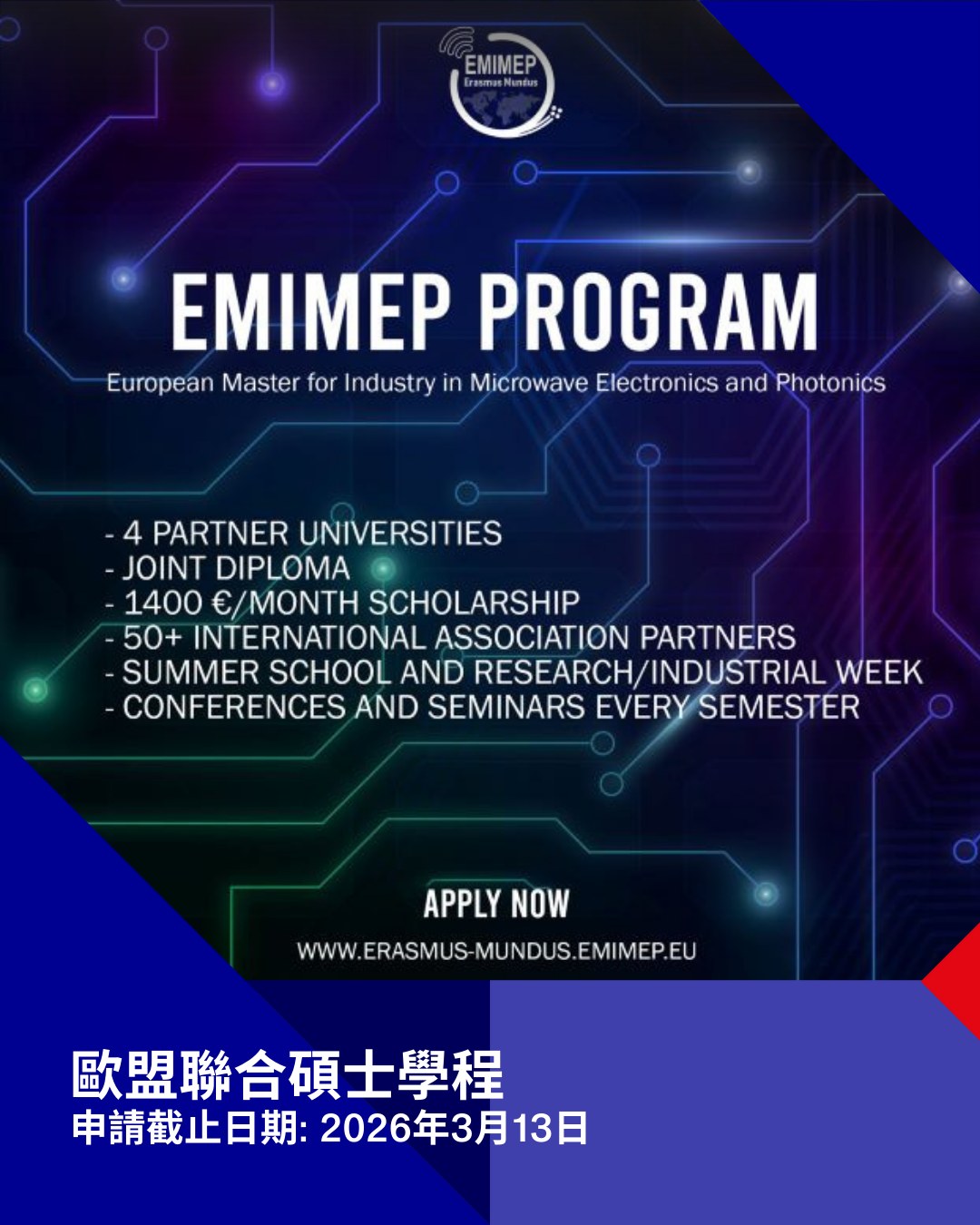 歐盟聯合碩士學程 EMIMEP - European Master for Industry in Microwave Electronics and Photonics現正開放申請中!